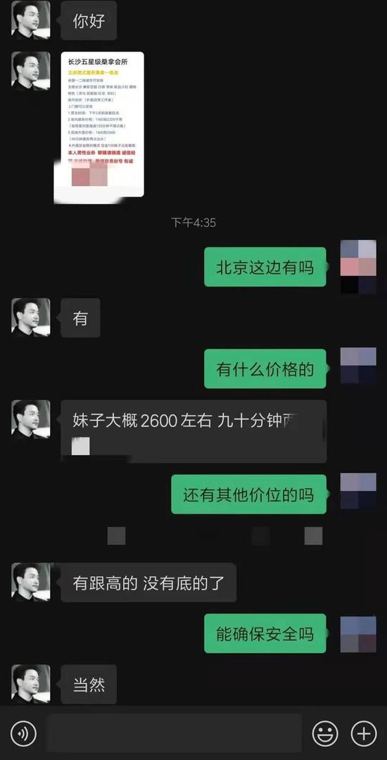 记者添加了两名“视频号”运营者的微信后,其中一名发来了招嫖广告,介绍了这样的“业务”内容:长沙某桑拿会所,全国一二线城市均可上门“安排”,“妹子大概2600左右”,不同“服务”类型价格不一。当记者询问是否安全时,该人士回答“当然”。