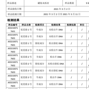 新京报记者选取了9罐品牌驼奶并送到专业机构检测,结果显示:有3款纯驼奶检出牛或羊DNA。那拉丝醇全脂驼乳粉的产品配料表中,只含生驼乳,应属于纯驼奶,但检测结果显示,这款产品中含有牛的DNA,这说明其中掺了牛乳。