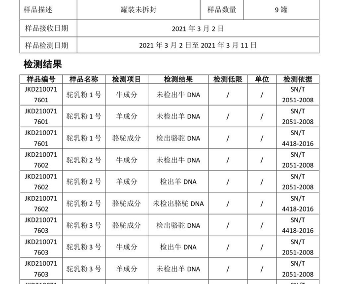 检测报告显示,3号样品为那拉丝醇全脂驼乳粉,检测出牛DNA。