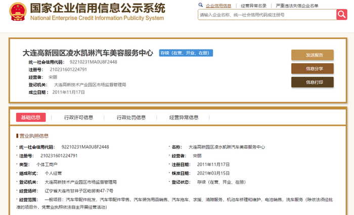 记者登录国家企业信用公示系统查询结果发现,大连高新园区凯琳汽车美容中心的经营范围为:三类汽车(车辆车身清洁维护、车辆四轮定位检测调整、车辆轮胎动平衡和修补)。