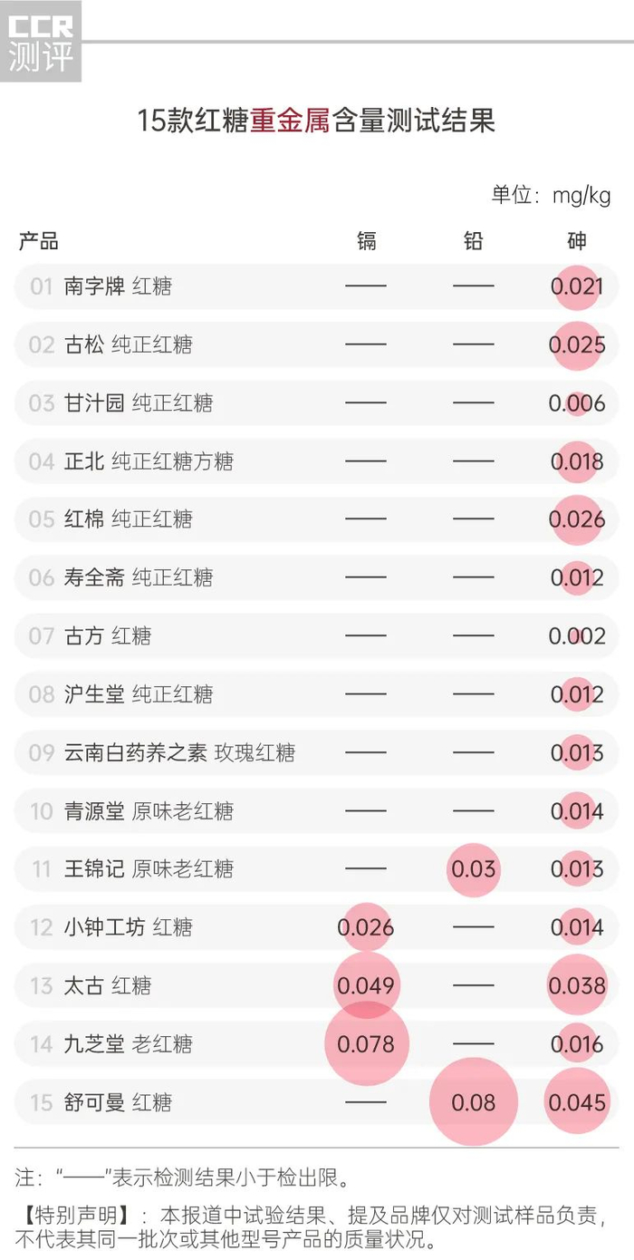 3、15款红糖均检出重金属砷,王锦记、小钟工坊、太古、九芝堂和舒可曼等5款同时检出2种重金属,不过,上述重金属的含量均在标准范围内,消费者无需太过担心。