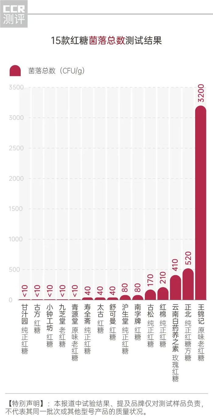 测试结果显示,正北纯正红糖方糖、王锦记原味老红糖等2款菌落总数分别达到520cfu/g和3200cfu/g,它们分别执行的商业标准和国家标准,商业标准无法查看,国家标准无菌落总数要求。