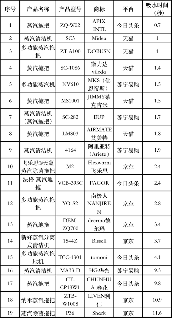 吸水性是指产品对水分的吸收能力,是评价拖布产品性能优劣的重要指标之一。此次比较试验吸水性项目测试结果整体较好,19个样品的吸水时间在0.7s-11.6s之间。