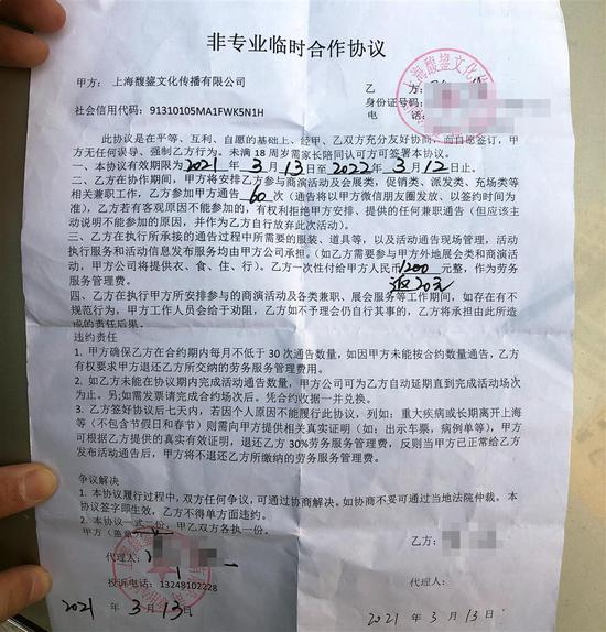 3月13日,急于求职的刘先生当场扫码缴纳了1200元,签下一纸《非专业临时合作协议》。协议中注明,个人原因7天内毁约退还30%的费用,一旦企业开始发布兼职信息费用则不退还。当晚7时许,一个名为“通告部”的微信主动加了刘先生,并告知他,兼职信息都会在朋友圈发布。“自己看,自己报名”。