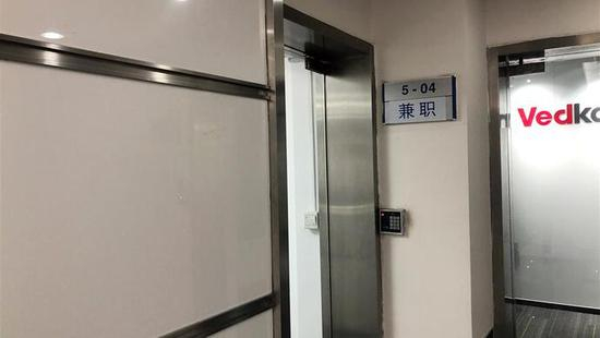 △天山路同达创业大厦504室很“低调”,门口铭牌上只有“兼职”二字。