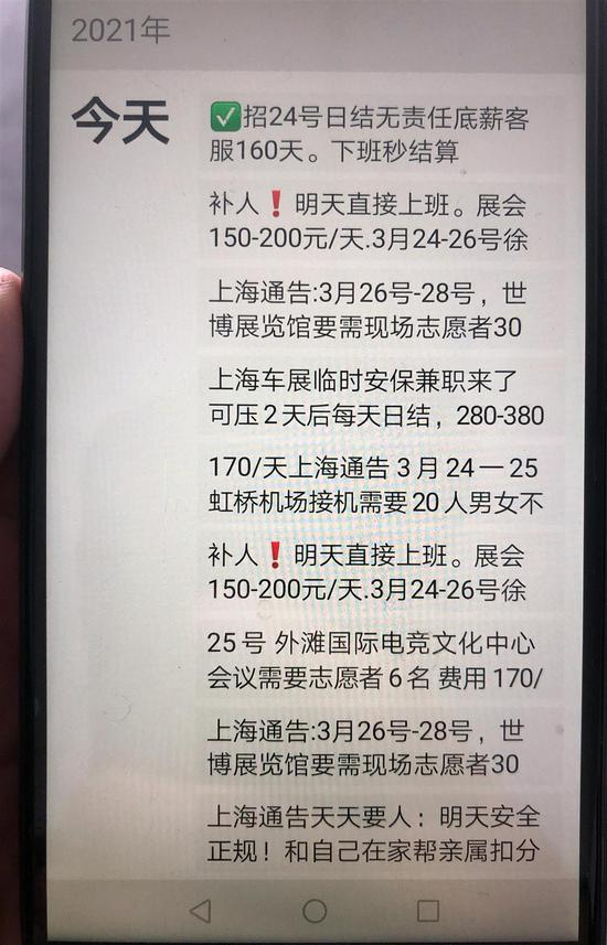 刘先生翻遍了“通告部”3日可见的微信朋友圈,发现绝大部分兼职报酬只有100余元一天。记者看到,3月23日通告部朋友圈发布的有160元一天的客服、150元到200元一天的展会兼职、170元一天的机场接机等等,只有一个车展夜间保安的工作报酬超过了300元。不仅60元每小时的测温员岗位不存在,58同城网上写着的动辄300多元一天的工作也找不到,这和刘先生的预期大相径庭。并且,朋友圈中发布的兼职工作信息后面均留有招工电话,刘先生需要自己联系对方报名,“这是叫介绍工作吗?”