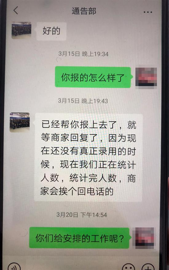 3月13日晚,感觉上当的刘先生找到了“通告部”交涉。在他的要求下,对方承诺为其单独操作报名60元每小时的测温员兼职工作。3月15日,刘先生询问进展,对方声称“报上去了”;3月20日,刘先生再次询问,对方又称“报名尚未结束”……除了刘先生外,四川来沪的蒋先生、山东来沪的梁先生均反映称,“58同城网上400元一天的贴标签工根本没有”“都是套路忽悠人的”。