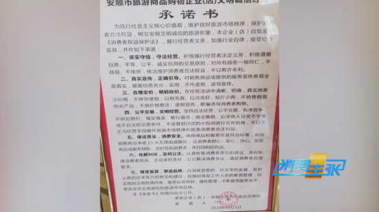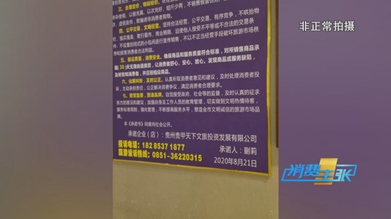 对游客来说,这本来是观光游览的休闲之旅,但在旅行社老板这,却变成了一场场博彩的赌局。大巴车直接开到了位于贵州省安顺市的一家购物店。导游说,这一站是合同上显示的神俊文旅小镇,然而记者看到,这里实际是销售翡翠玉石的地方。墙上的承诺书显示,开设购物店的是贵州贵甲天下文旅投资发展有限公司。