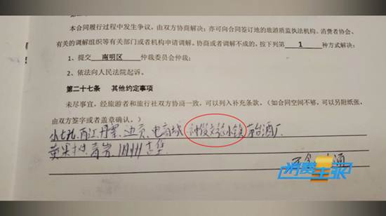 记者这时仔细查看合同,这是易程国旅工作人员填写的内容,发觉这和行程单上显示的又不一样。行程单上写着,珠宝玉石中心字样,但在合同上,根本没有珠宝玉石几个字,唯一和购物可能搭边的只有电商城。怎么到了导游这里,就变成了合同当中有购物店呢?