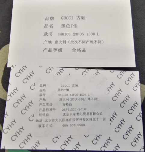 ➪其中一款在“GUCCI京东自营专区”销售的标称“经销商:北京京东世纪贸易有限公司”的“GUCCI”牌黑色T恤,未按要求标明所执行的正确的国家、行业、地方或企业的产品标准编号以及产品安全类别。明示的产品标准号“QB/T 1333-2010”为已作废的“背提包”产品标准。