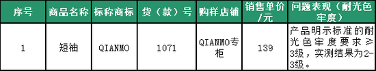 色牢度是指纺织服装产品在使用或加工过程中,经受外部因素作用后,保持其原来色泽的能力。1款标称为“QIANMO”的短袖样品耐光色牢度不符合标准要求。