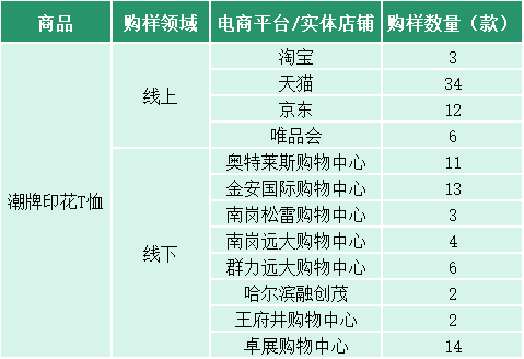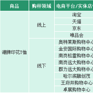 本次比较试验样品是由黑龙江省消费者协会以及检测机构的工作人员以普通消费者的身份分别在淘宝、天猫、京东、唯品会等线上平台和哈尔滨市各实体专卖店铺购买,共计62个品牌110款潮牌印花T恤样品(线上55款,线下55款),其中48个品牌为线上线下同品牌购买。样品价格从87.50元到4099.99元不等。