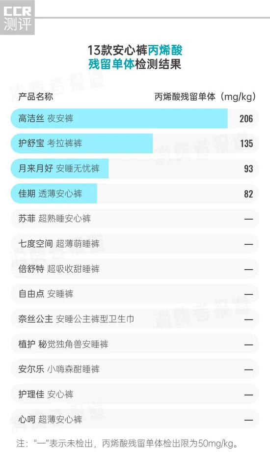 在对13款安心裤里的高吸收性树脂进行检测后,发现高洁丝、护舒宝、月来月好、佳期四款含有一定量丙烯酸残留单体,含量在82~206mg/kg之间,未超出标准要求,因此,正常使用不会对皮肤造成刺激。