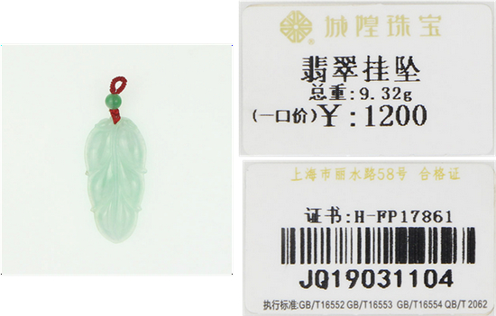 如上海市浦东新区金杨新村街道隍金金店销售的标称由福州依强珠宝首饰有限公司生产(或供货)的城隍珠宝牌翡翠挂坠(型号规格:翡翠,总重:9.32g;生产日期或批号:未标注),材质名称缺失,未标注配镶石英岩玉(处理),与标准要求不符。