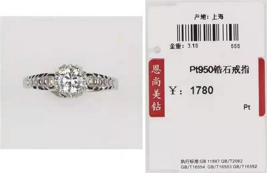 上海恩尚珠宝有限公司宝山分公司在黄金广场宝山店销售的标称由上海恩尚珠宝有限公司生产(或供货)的恩尚美钻牌Pt 950锆石戒指(型号规格:Pt 950,锆石,金重:3.16;生产日期或批号:未标注),实测为合成立方氧化锆,企业标称锆石,与实测不符。