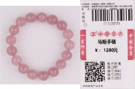 上海市宝山区慧缘珠宝店在龙湖天街宝山店销售的标称由中国金店(香港)有限公司生产(或供货)的中国金店牌马粉手链(型号规格:马粉;生产日期或批号:未标注),实测为芙蓉石,企业标称马粉,与标准要求不符。