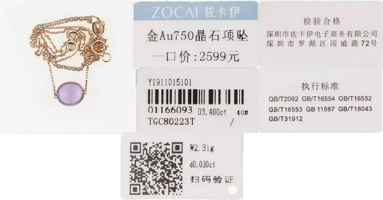 如上海经汉商贸有限公司长宁分公司在龙之梦长宁店销售的标称由深圳市佐卡伊电子商务有限公司生产(或供货)的佐卡伊牌金Au750晶石项坠(型号规格:金Au750,晶石,D3.400ct,d0.030ct,W2.31g;生产日期或批号:未标注),实测为紫晶,企业标称晶石,与标准要求不符。