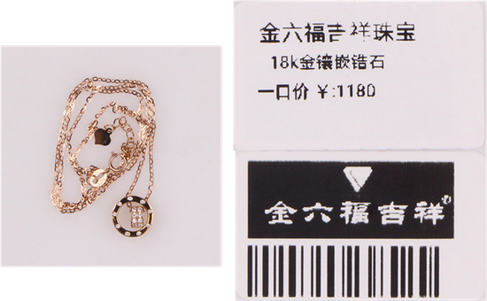 如上海市徐汇区弘法珠宝首饰店在梅陇商业中心徐汇店销售的标称由其生产(或供货)的金六福吉祥牌18K金镶嵌锆石(规格型号:18K金,镶嵌锆石;生产日期或批号:未标注),饰品品种名称缺失,应标注为项链,与标准要求不符。