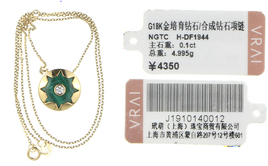 如玳萌(上海)珠宝商贸有限公司虹口龙之梦分公司在龙之梦虹口店销售的标称由玳萌(上海)珠宝商贸有限公司生产(或供货)的VRAI牌G18K金培育钻石/合成钻石项链(型号规格:G18K金,培育钻石/合成钻石,主石重: 0.1ct ,总重4.995g;生产日期或批号:2019年10月23日),饰品总质量实测为4.10g,企业标称4.995g,与实测不符。