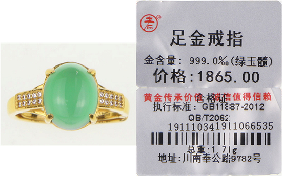 有8批次标签质量不合格。如上海市奉贤区中呈黄金店销售的未标注生产(或供货)企业名称的老牌足金戒指(型号规格:足金,戒指,金含量:999‰ (绿玉髓),总重:1.71g;生产日期或批号:未标注),质量应标注为2.36g,企业标称1.71g,与标准要求不符。不合格产品饰品总质量不合格,因此,对应的标签质量也不合格。