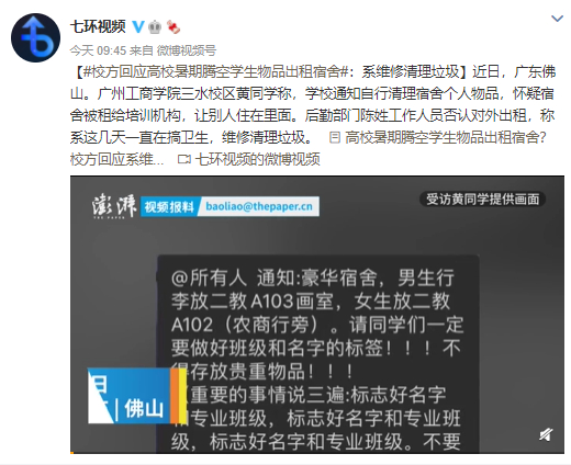 校方回应高校暑期腾空学生物品出租宿舍:系维修清理垃圾