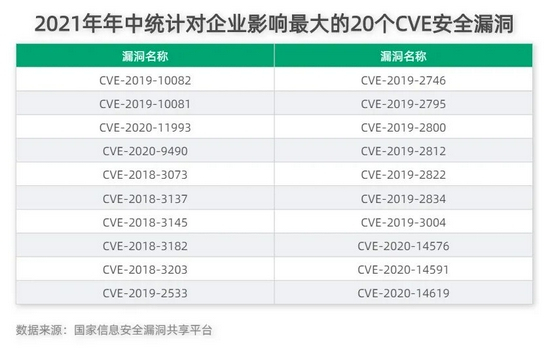 2021年年中统计,如下20个CVE安全漏洞对企业影响最大,其中15个漏洞为2018年到2019年提交的漏洞,表明相关上市公司安全意识与对漏洞的重视有待提高。
