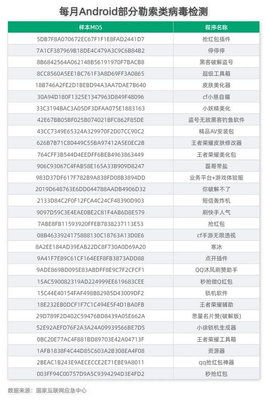 6月Android部分勒索病毒监测显示,大部分勒索病毒为工具类APP,包括游戏外挂类、红包点赞类等,安装一些工具类的APP的时候一定要在正规下载渠道进行下载。