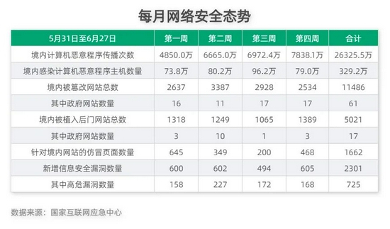 从仿冒网站、漏洞数量等看出,6月处于平稳态势,其中仿冒网站从月初600余个到月末400余个,整体体量直线下降,仿冒网站下降也归功于全国反诈工作较为成功。