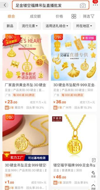 “还有很多宝宝说没有抢到,再上200单!这个价格已经是破价了……”全程不到4分钟,董先生直播间售卖的这条足金镂空福牌吊坠的销量显示已售2195件。但在1688软件(阿里巴巴旗下的一款批发软件)上搜索同款项链,“足金镂空福牌吊坠直播批发”,售价仅在36元至85元之间。