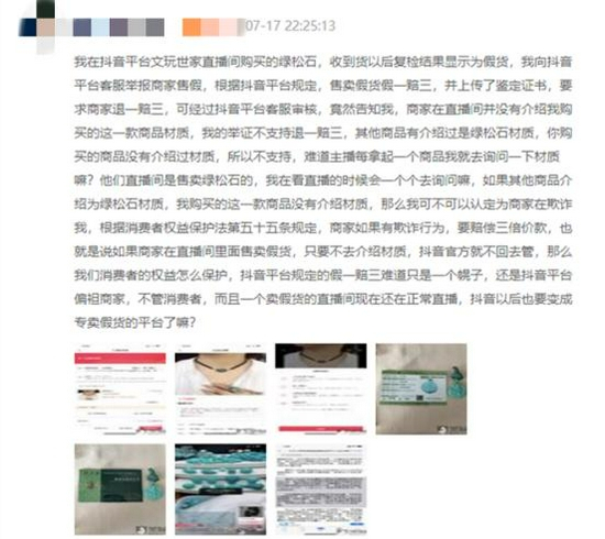 黑猫投诉平台上,一位用户表示,其在抖音直播平台购买了一块绿松石,收到货后复检结果显示为假货。随后,该用户向抖音平台投诉举报,并上传了相关鉴定证明。
