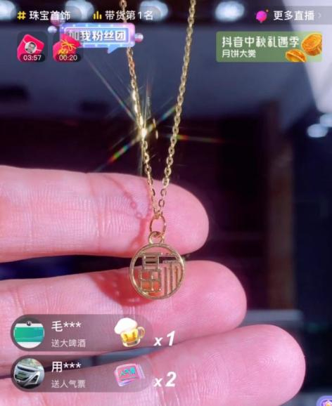 “3个9的足金镂空福牌吊坠,每个女孩子都拒绝不了的一条项链,原价799元,今天只要199元上车,售完不补!”在抖音平台的珠宝直播间,一位自称“董先生”的主播在镜头前大声吆喝着,刚上架的500条项链就被抢购一空。