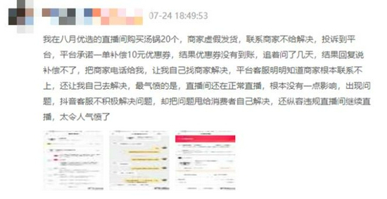 其中一位消费者表示,其在抖音直播间购买了20个汤锅,商家虚假发货,联系商家不给解决,投诉到直播平台,原本承诺予以一单补偿10元的优惠券也迟迟没有到账。
