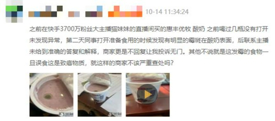 一位用户表示,其在快手直播平台一位拥有千万粉丝的主播的直播间购买了“惠丰优牧”品牌的酸奶,食用过程中发现酸奶表面有明显的霉斑;另一位用户也表示,其在快手平台某位拥有两千余万粉丝的主播的直播间购买的“奥洛菲”牌护肤品,使用后脸部严重过敏。