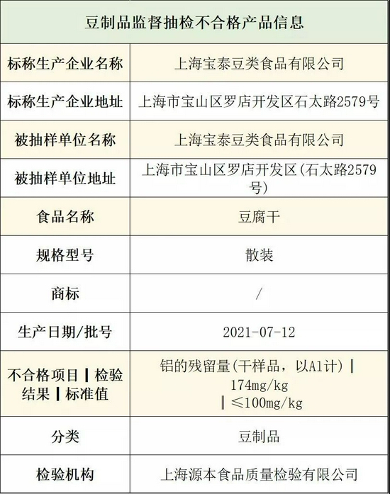近日,上海市市场监督管理局发布2021年第35期省级食品安全抽检信息。本次抽检信息涉及8大类食品652批次样品,不合格1批次。不合格样品为,上海宝泰豆类食品有限公司生产并销售的豆腐干〔不合格项目:铝的残留量(干样品,以Al计)〕。