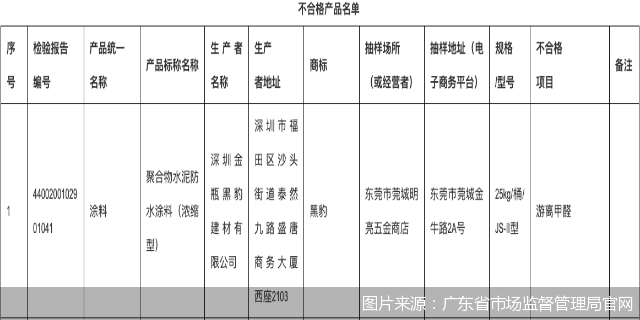 不合格的“黑豹”和“正黑豹”两个商标的产品同属“深圳金瓶黑豹建材有限公司”,前者产品标称名称为“聚合物水泥防水涂料(浓缩型)”,被检出“游离甲醛”项目不合格,后者产品标称名称为“聚合物水泥防水涂料”,被检出“断裂伸长率(无处理)”项目不合格。这两款涂料的生产者地址同为“深圳市福田区沙头街道泰然九路盛唐商务大厦西座2103”,规格型号同为“25kg/桶/JS-II型”。