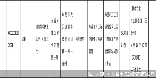 不合格的“强力黑豹”商标属于“东莞市雄发粘合剂有限公司”,产品标称名称为“强力黑豹防水涂料(第三代)”,生产者地址为“东莞市大朗镇犀牛陂村公凹横一路一巷3号”,规格型号为“25L/桶/JS-III型”,它被检出“固体含量;拉伸强度(无处理);断裂伸长率(无处理);不透水性”4个项目不合格。