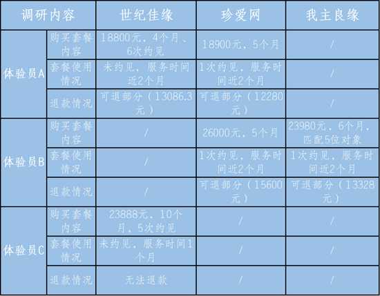 本次调研中,部分网站对充值会员退费规则未完全明确,实体门店的所有会员协议中也都未明确规定解约条件及双方应当承担的违约金比例,消费者在购买时无法得知所签订合同的具体解约情况,会员协议存在披露不完善情况,侵犯消费者知情权。另外世纪佳缘网站钻石人工牵线会员明确提示可以退款,世纪佳缘B店会员协议明确表示消费者可以协商解约,但最终实际退款时均推脱不履行责任,其退费规则由经营者自行解释操作,侵犯了消费者公平交易权。