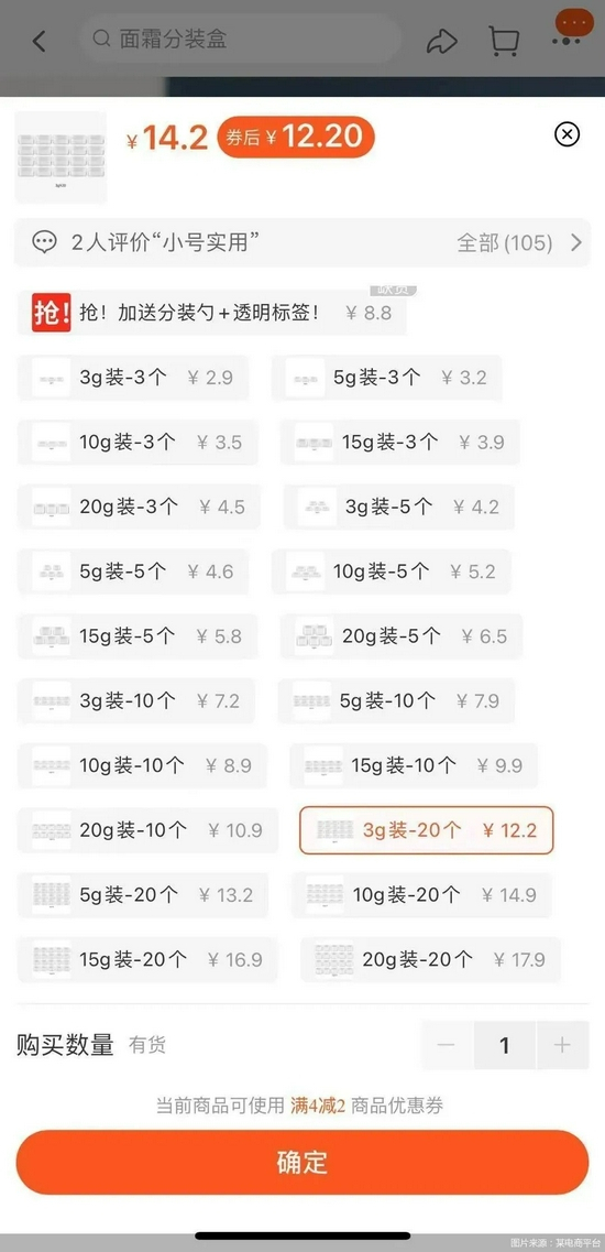 想在化妆小样的市场中分一杯羹,似乎也不是难事。一位从事化妆品分装工作的商家表示,这门生意前期投入还是比较小的,“酒精消毒片、分装工具、电子秤等等加起来花了100多块钱,且可以长期使用,而装化妆品的盒子一个几毛钱,买的多的话更便宜”。