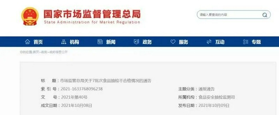 10月9日,国家市场监督管理总局官网发文,近期,市场监管总局组织食品安全监督抽检,抽取粮食加工品、食用农产品、食糖、茶叶及相关制品、乳制品、饮料、酒类、糕点、炒货食品及坚果制品、饼干、淀粉及淀粉制品、方便食品、薯类和膨化食品、蛋制品、蜂产品、罐头、蔬菜制品、水果制品、肉制品、水产制品、调味品、速冻食品、糖果制品、婴幼儿配方食品、保健食品、特殊膳食食品和食用油、油脂及其制品等27大类食品307批次样品,检出其中食用农产品、炒货食品及坚果制品、方便食品、蔬菜制品和水果制品等5大类食品7批次样品不合格。发现的主要问题是,生物毒素、农兽药残留超标、重金属污染、食品添加剂超限量使用、质量指标不达标等。