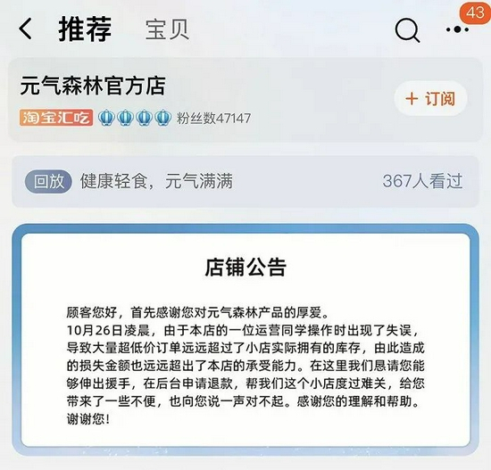 涉事的淘宝元气森林官方店称