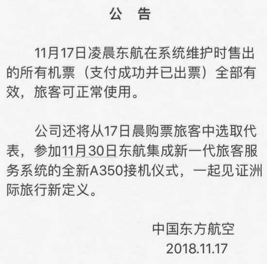 而在拼多多之前,东航也发生过“东航白菜价机票事件”。2018年11月17日,由于系统维护,东航出现了超低价bug,用户90元就能买到头等舱。事故发生后,东航也发了公告,不过,与拼多多不同的是,东航的应对措施是“系统维护时出售的所有机票全部有效,旅客可正常使用”。