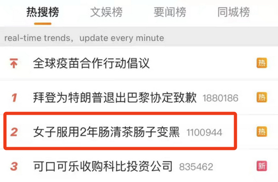 今日,一则《女子服用两年肠清茶,肠子变黑》的新闻登上热搜。据人民网报道,广州的黄女士,长期服用肠清茶,被确诊为结肠黑变病。
