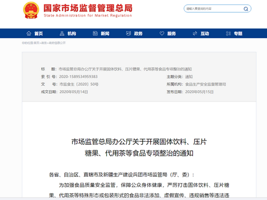 2020年5月,市场监管总局办公厅发布了《关于开展固体饮料、压片糖果、代用茶等食品专项整治》的通知,严厉打击固体饮料、代用茶、茶制品等特殊形态或包装形式的食品非法添加、虚假宣传、违规销售等违法违规行为。随后,各地市场监管部门也陆续开展了专项整治工作。