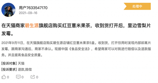 无独有偶,另据黑猫投诉,有用户表示,在旗舰店购买碧生源红豆薏米果茶,收到货后发现果茶中的雪梨片竟然已经发霉,该用户发布的图片可见,灰黑色的霉斑清晰可见。