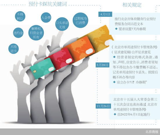 此后,11月26日,北京市十五届人大常委会第三十五次会议通过了《北京市单用途预付卡管理条例》,《条例》将自2022年6月1日起开始施行。条例共五章三十五条,其中内容包括此前被热议的设立退卡“7天冷静期”。