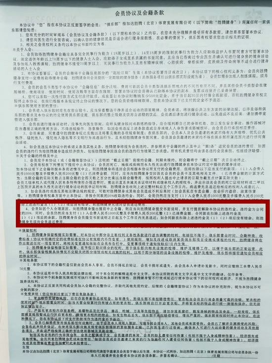 记者在北京胜腾健身的会员合同中也看到类似规定:“会员以合理理由提前终止合同需扣除入会费1000元、手续费200元以及已消费金额”。对于未开卡7天冷静期退款的规定,相关负责人表示“暂时没有这项措施,但可以转卡,但需要收取500元转卡费”。