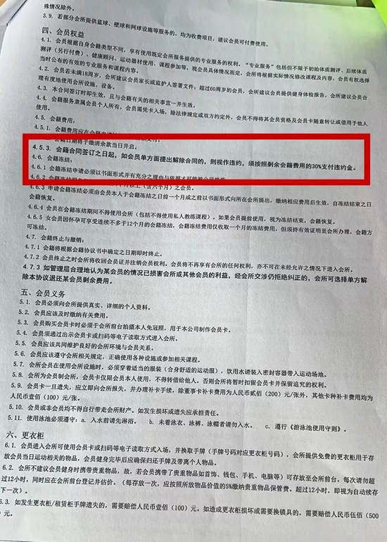 记者在威尔仕健身的会员卡合同中看到,其中有“如会员单方面提出解除合同的,则视作违约,须按照剩余会籍费用的30%支付违约金”的内容。