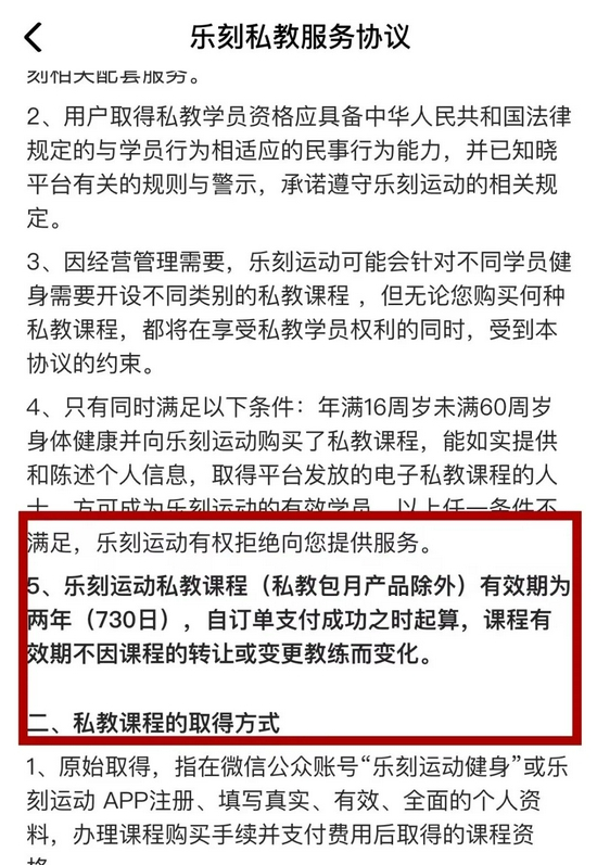 此前,记者调查时曾发现,乐刻健身的购卡协议中规定:“1V1、1V2私教课程有效期为两年(730日),自订单支付成功之时起算,课程有效期不因课程的转让或变更教练而变化,以第一笔订单支付成功时间计算有效期。有效期满后,课程失效,用户无法再进行约课、退款、转让等操作。”内容看起来十分“霸王”。