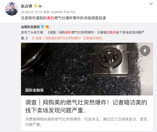 2020年8月,知名互联网企业法律顾问赵占领通过新浪微博表示,自己购买的美的燃气灶才使用不超过十天就突然爆炸,要求美的必须给出正式的调查处理结果,并不断更新最新进展。