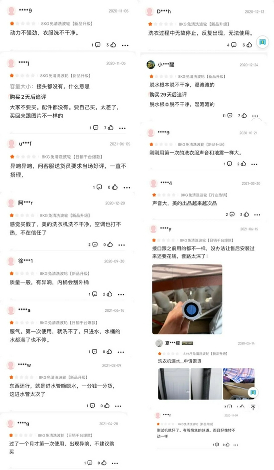 石女士表示,购买洗衣机选择美的这个品牌是基于对这个品牌的信任,《消费者报道》了解到,石女士购买这款洗衣机花费了869元,该款洗衣机在京东洗衣机热卖榜排行第一名。不过,该商品的评论褒贬不一,有人夸其性价比高,也有不少消费者反映该款洗衣机存在异响、不出水,进水管无法安装、衣服洗不干净等问题。